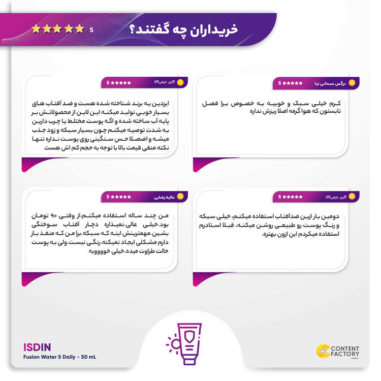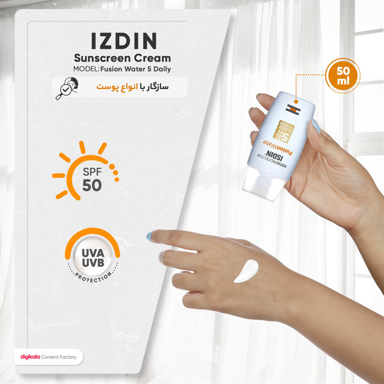 کرم ضدآفتاب بیرنگ ایزدین SPF50 مدل Fusion Water 5 Daily مناسب انواع پوست، حجم 50 میلیلیتر