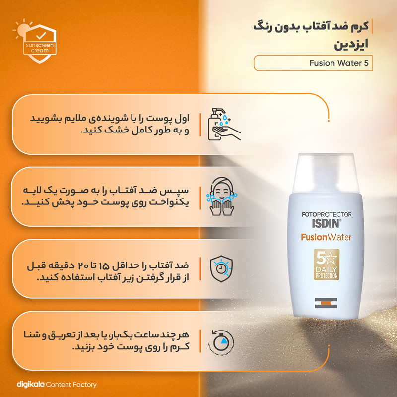کرم ضدآفتاب بیرنگ ایزدین SPF50 مدل Fusion Water 5 Daily مناسب انواع پوست، حجم 50 میلیلیتر